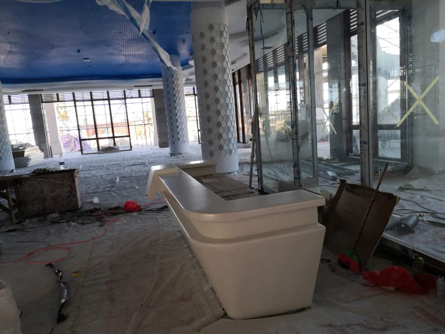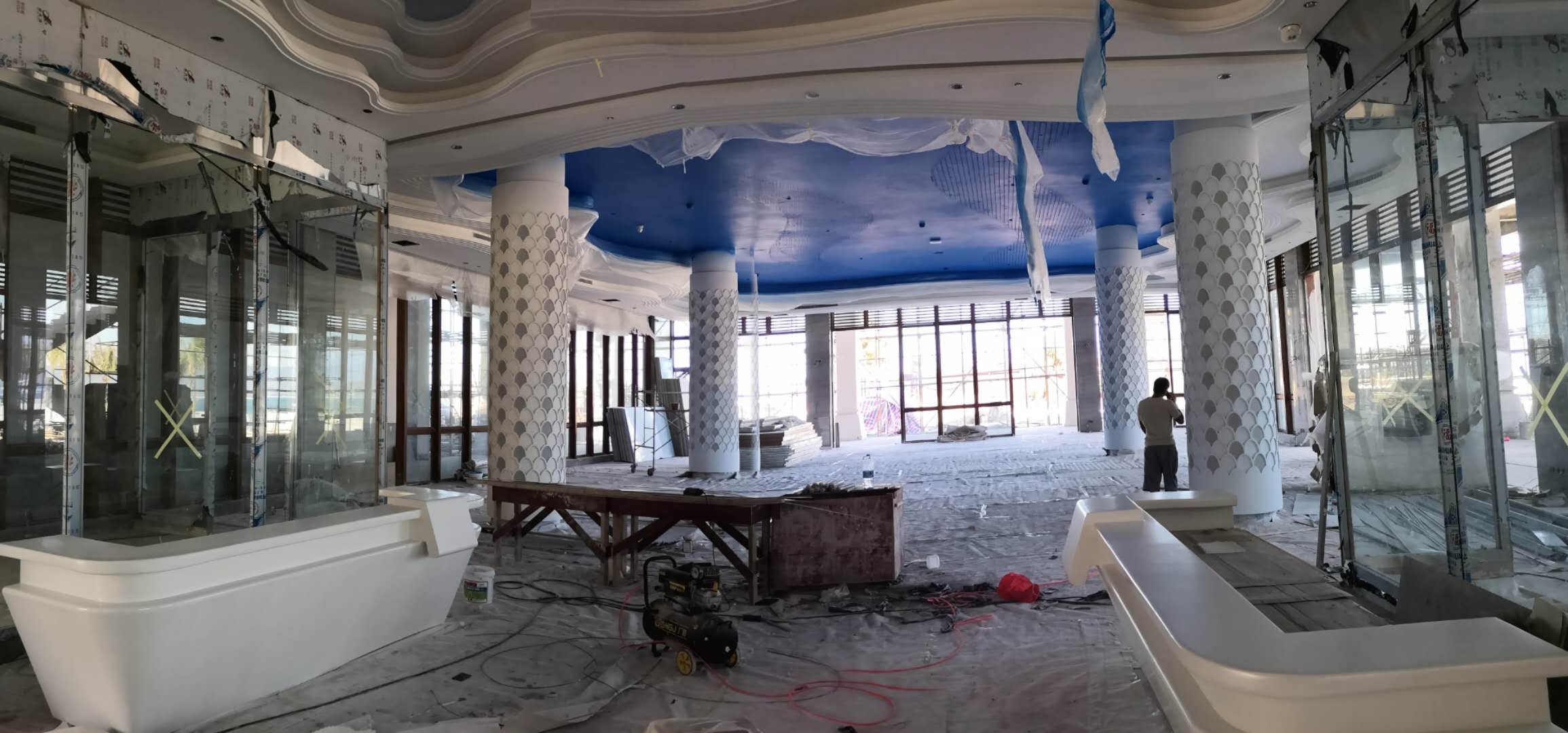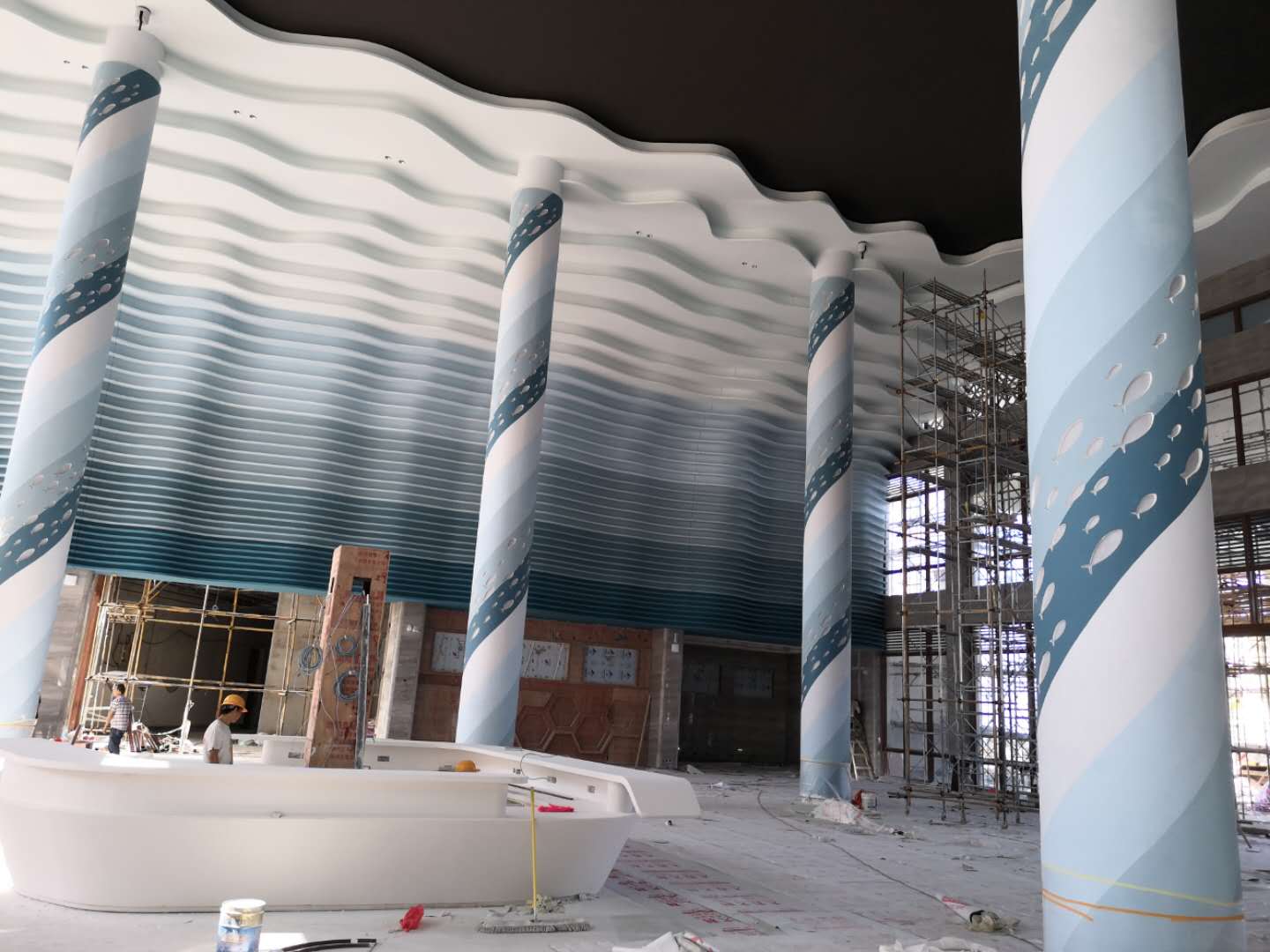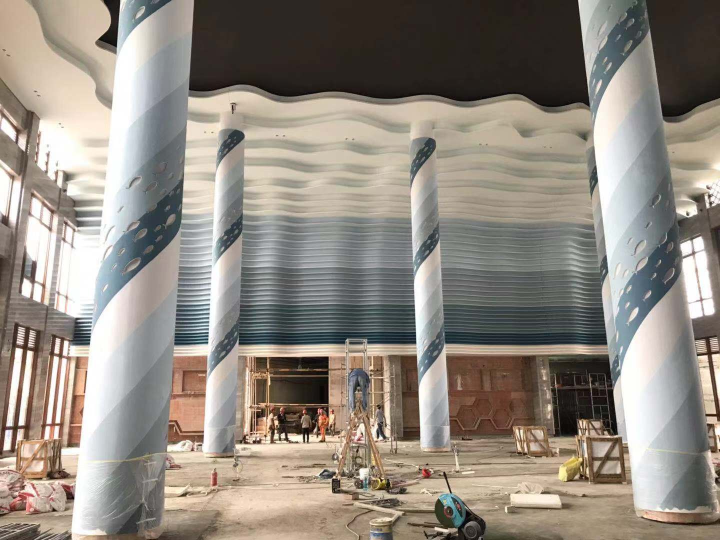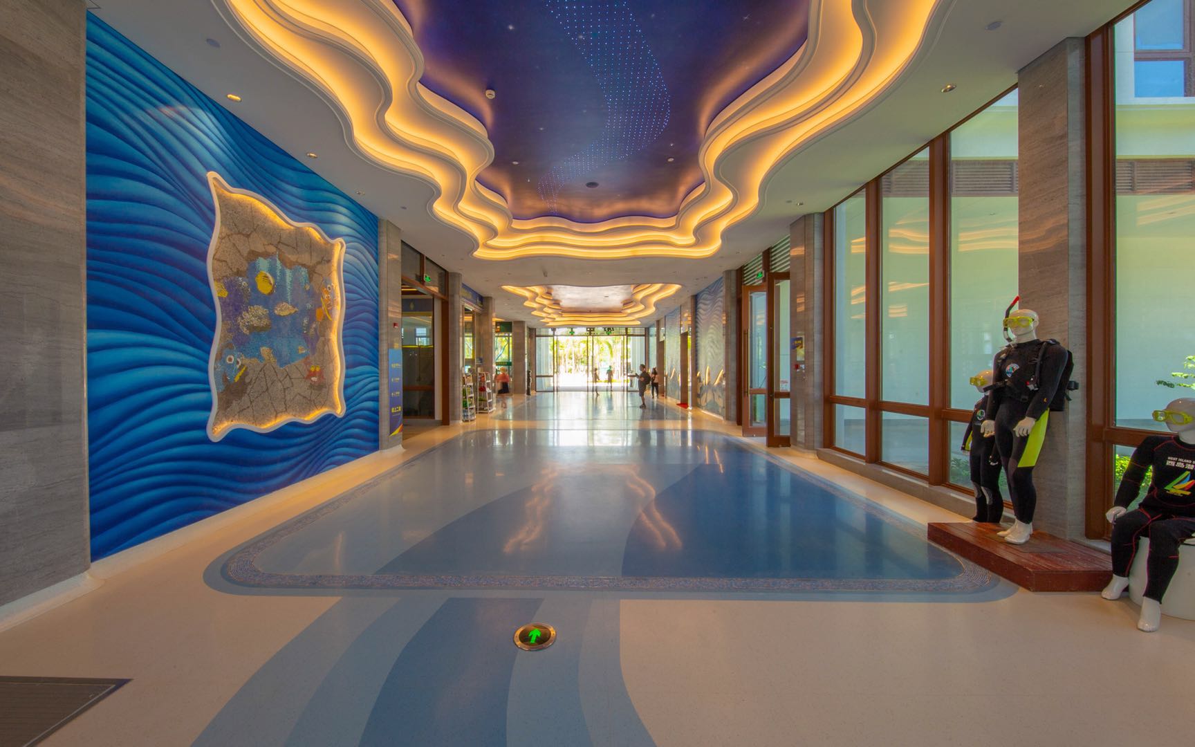 项目概况:西岛游客中心坐落在珊瑚海岸的婆娑椰林间,与轻风浪涛相依偎,与碧海蓝天相守望;游客大厅以静谧唯美的海洋色系为主,硕大的中央梁柱上刻有精美的鱼群浮雕,环着台柱扶摇而上,气势恢宏壮美。